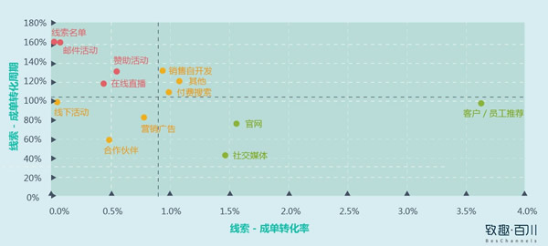 转化率平均线右边,线索最好的为客户/员工推荐、官网、社交端。