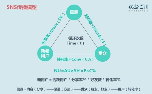 信源-内容(分享)——渠道(方法)——受众(朋友、好友)——用户(转化率)